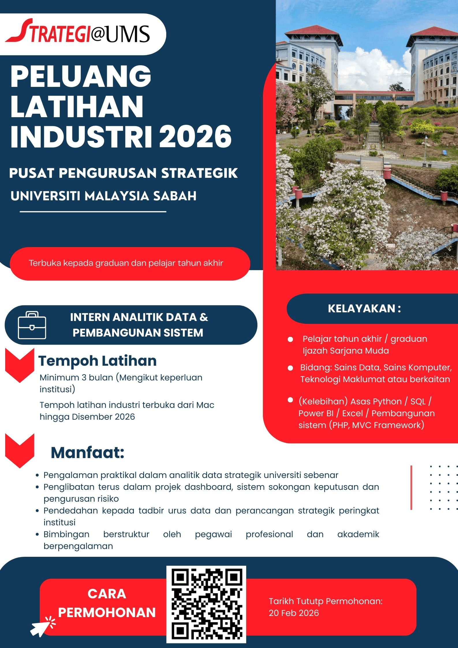 Pusat Pengurusan Strategik (Strategi@UMS), Universiti Malaysia Sabah membuka peluang latihan industri bagi tahun 2026 kepada graduan dan pelajar tahun akhir!