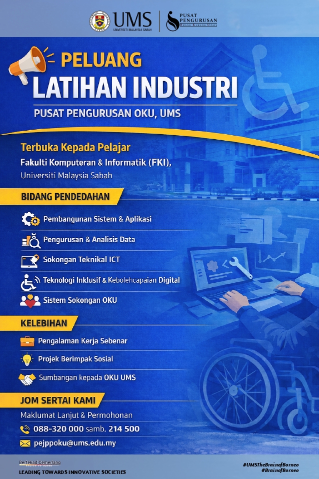 Dimaklumkan bahawa Pusat Pengurusan OKU, UMS membuka peluang Latihan Industri kepada pelajar Fakulti Komputeran dan Informatik (FKI) bagi sesi latihan industri yang akan datang.