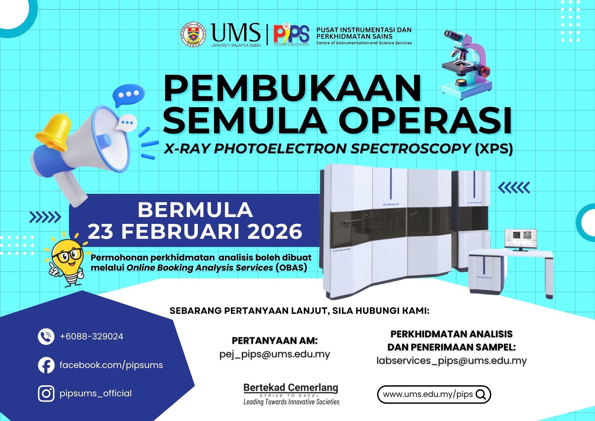 Sukacita dimaklumkan bahawa perkhidmatan X-ray Photoelectron Spectroscopy (XPS) di Pusat Instrumentasi dan Perkhidmatan Sains (PIPS), Universiti Malaysia Sabah akan dibuka semula mulai 23 Februari 2026. Sehubungan dengan itu, permohonan penggunaan perkhidmatan ini akan dibuka bermula pada tarikh tersebut.