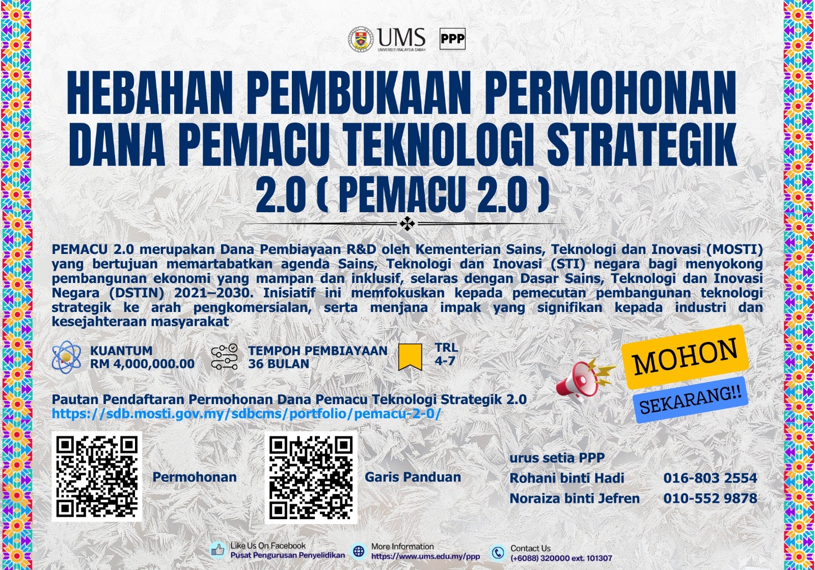 Dimaklumkan bahawa permohonan Dana Pemacu Teknologi Strategik 2.0 (PEMACU 2.0) kini dibuka.