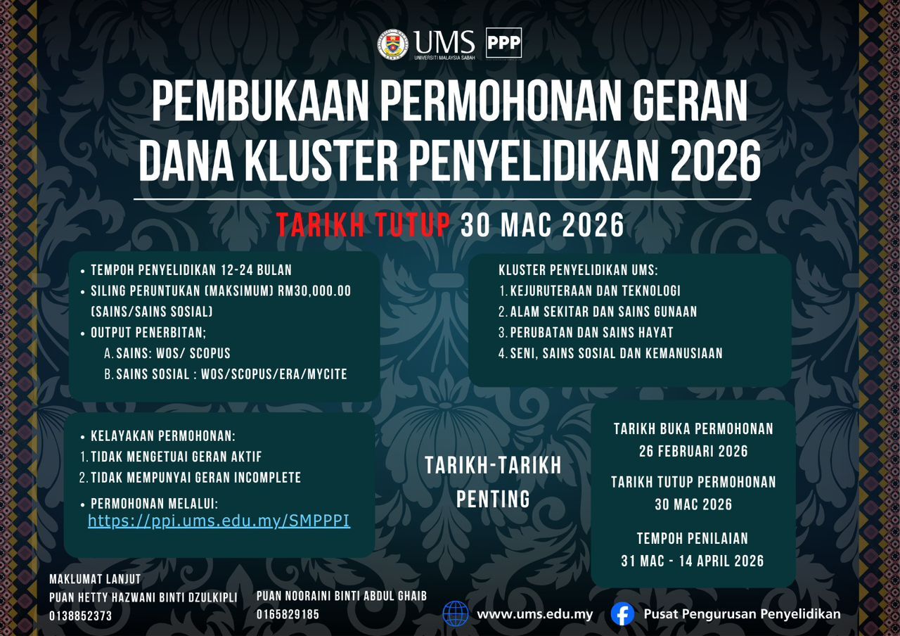 Sukacita dimaklumkan pihak Pusat Pengurusan Penyelidikan telah mula membuka permohonan Dana Kluster Penyelidikan Tahun 2026.