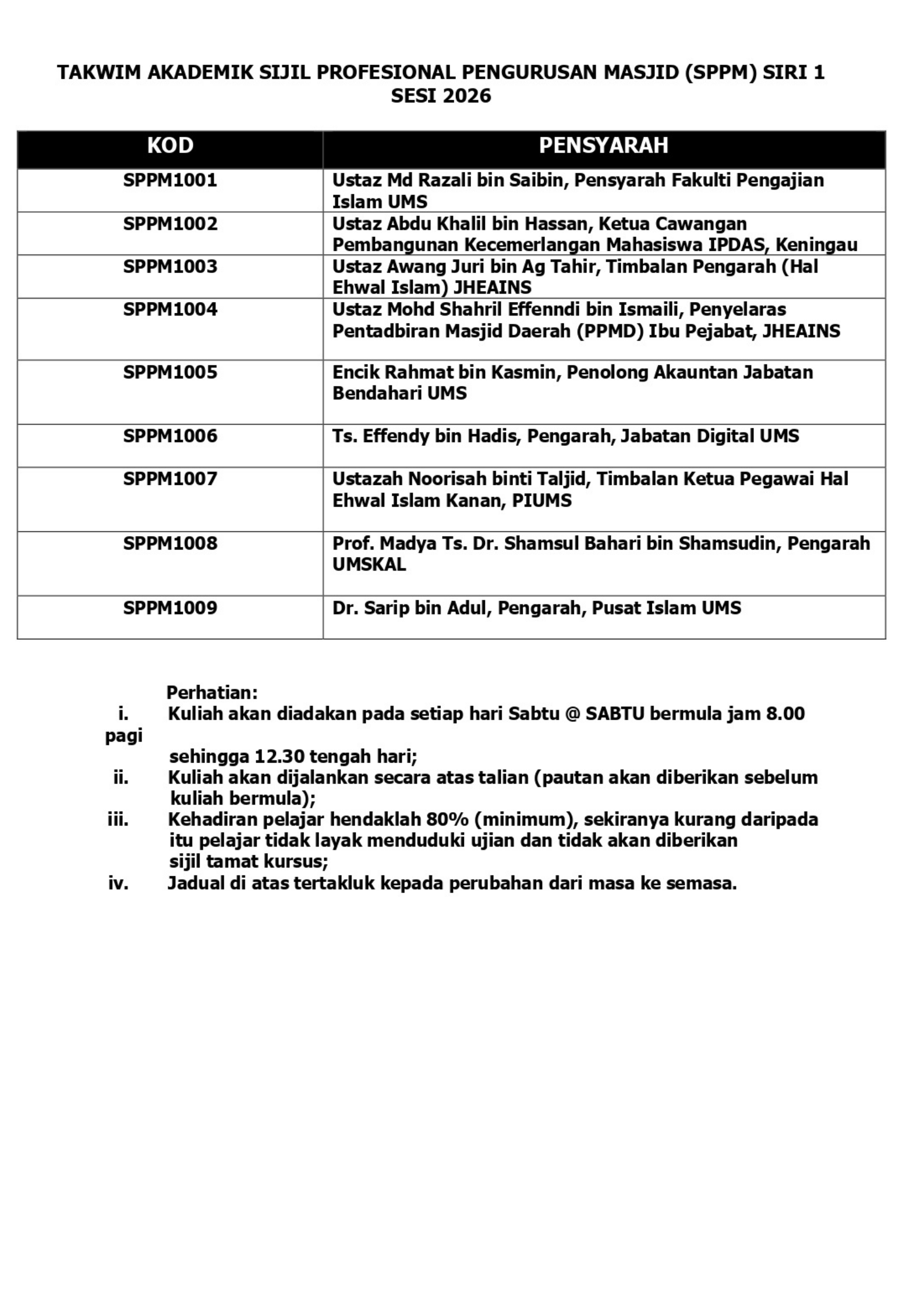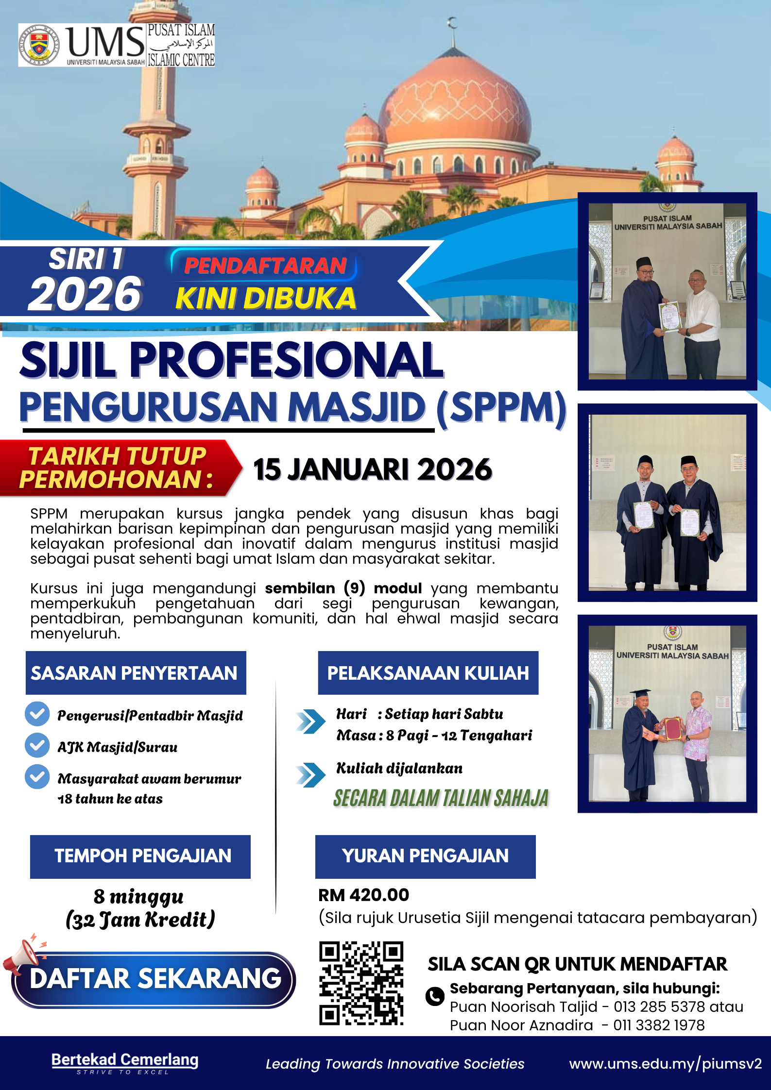 Assalamualaikum WBT, Sukacita dimaklumkan bahawa Unit Pengajian Islam Sepanjang Hayat (PISH), Pusat Islam Universiti Malaysia Sabah (UMS) dengan kerjasama Jabatan Hal Ehwal Agama Islam Negeri Sabah (JHEAINS) membuka pengambilan peserta bagi Sijil Profesional Pengurusan Masjid (SPPM) Siri 1 Sesi 2026.