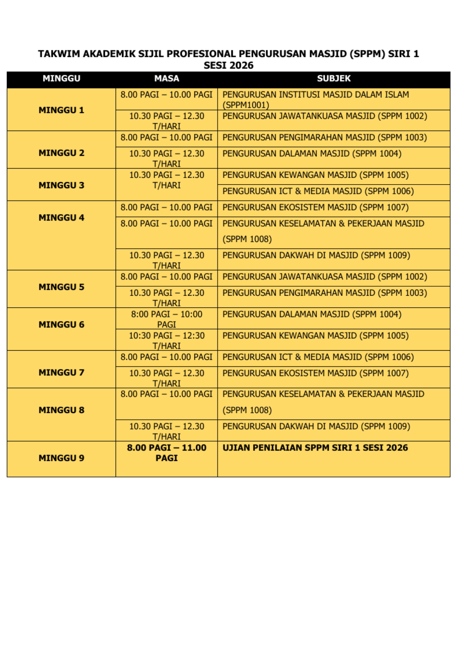 MAKLUMAN PENDAFTARAN PESERTA SIJIL PROFESIONAL PENGURUSAN MASJID (SPPM) SIRI 1 SESI 2026 – KINI DIBUKA