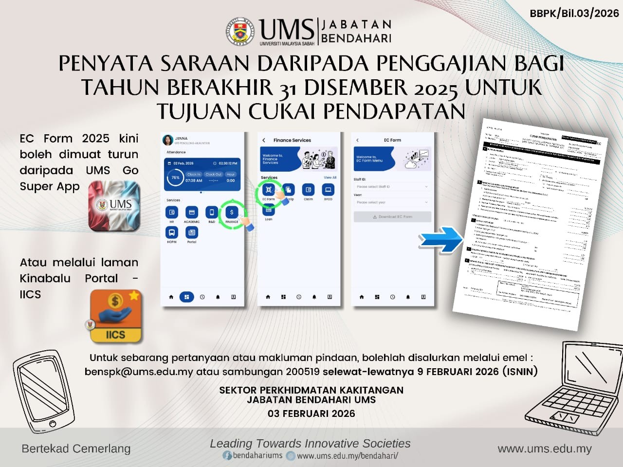 Adalah dimaklumkan bahawa Borang EC tahun 2025 kini boleh dimuat turun daripada Kinabalu Portal UMS melalui pautan berikut:
