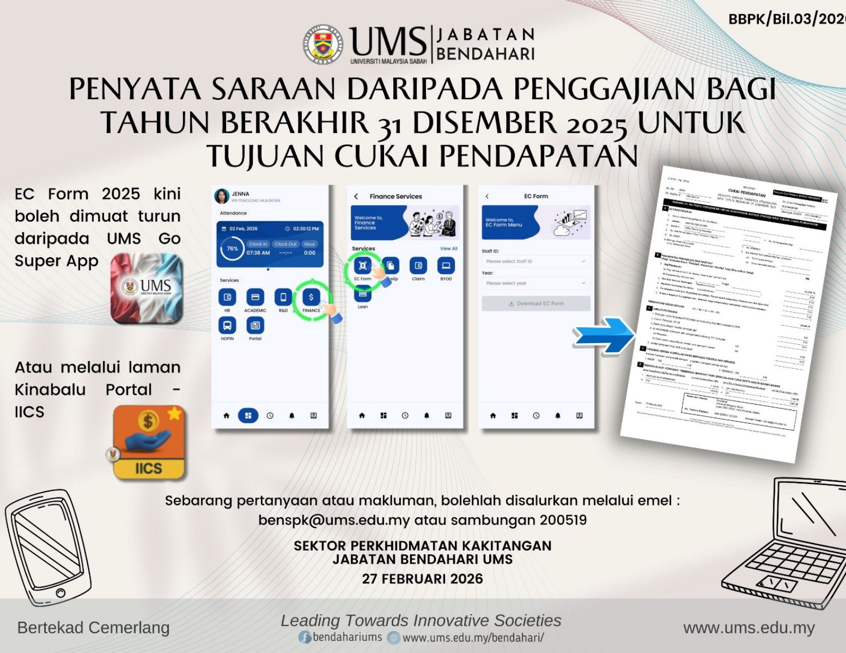 Adalah dimaklumkan bahawa Borang EC tahun 2025 boleh dimuat turun daripada Kinabalu Portal UMS melalui pautan berikut: