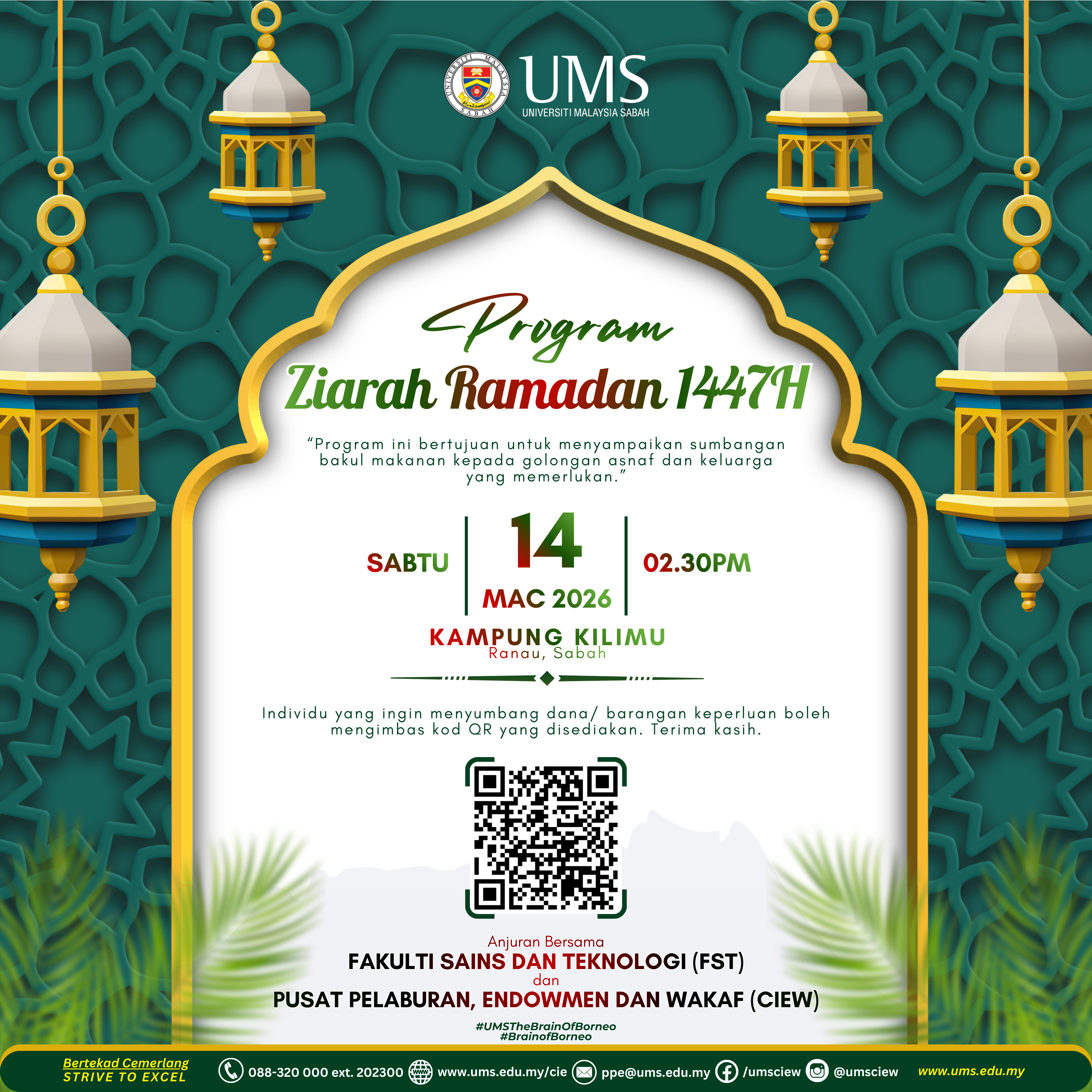 Pihak CIEW dan FST akan mengadakan Program Ziarah Ramadan 1447 di Kampung Kilimu, Ranau, Sabah pada 14 Mac 2026 (Sabtu). Individu yang ingin menyumbang dana/ barang keperluan boleh mengimbas kod QR yang disediakan. Terima kasih.