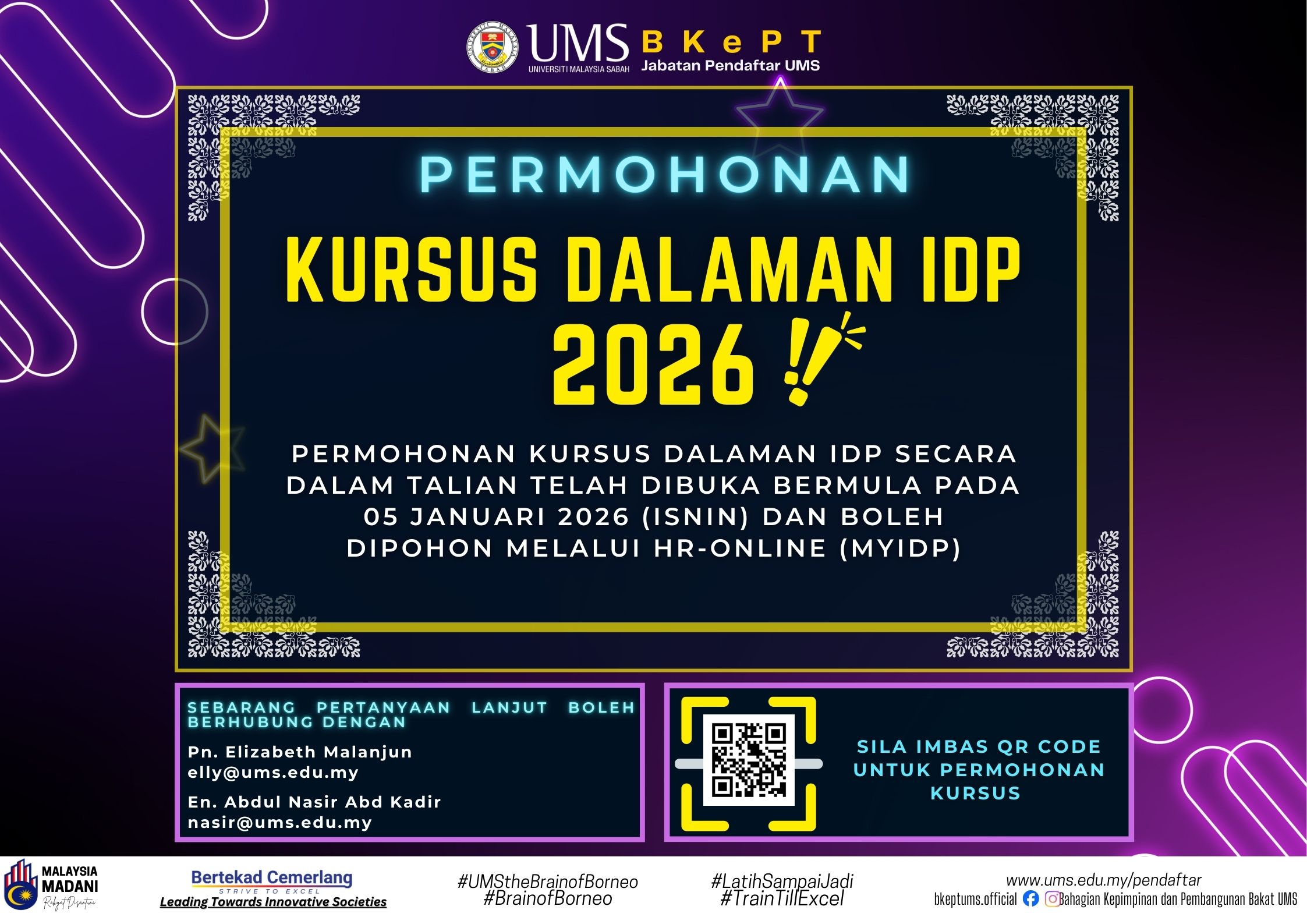 02. Sukacita dimaklumkan Permohonan Kursus Dalaman IDP Tahun 2026 telah dibuka bermula pada 05 Januari 2026 (Isnin) dan boleh dipohon melalui sistem HR-Online (MyIDP) di pautan https://kinabalu.ums.edu.my