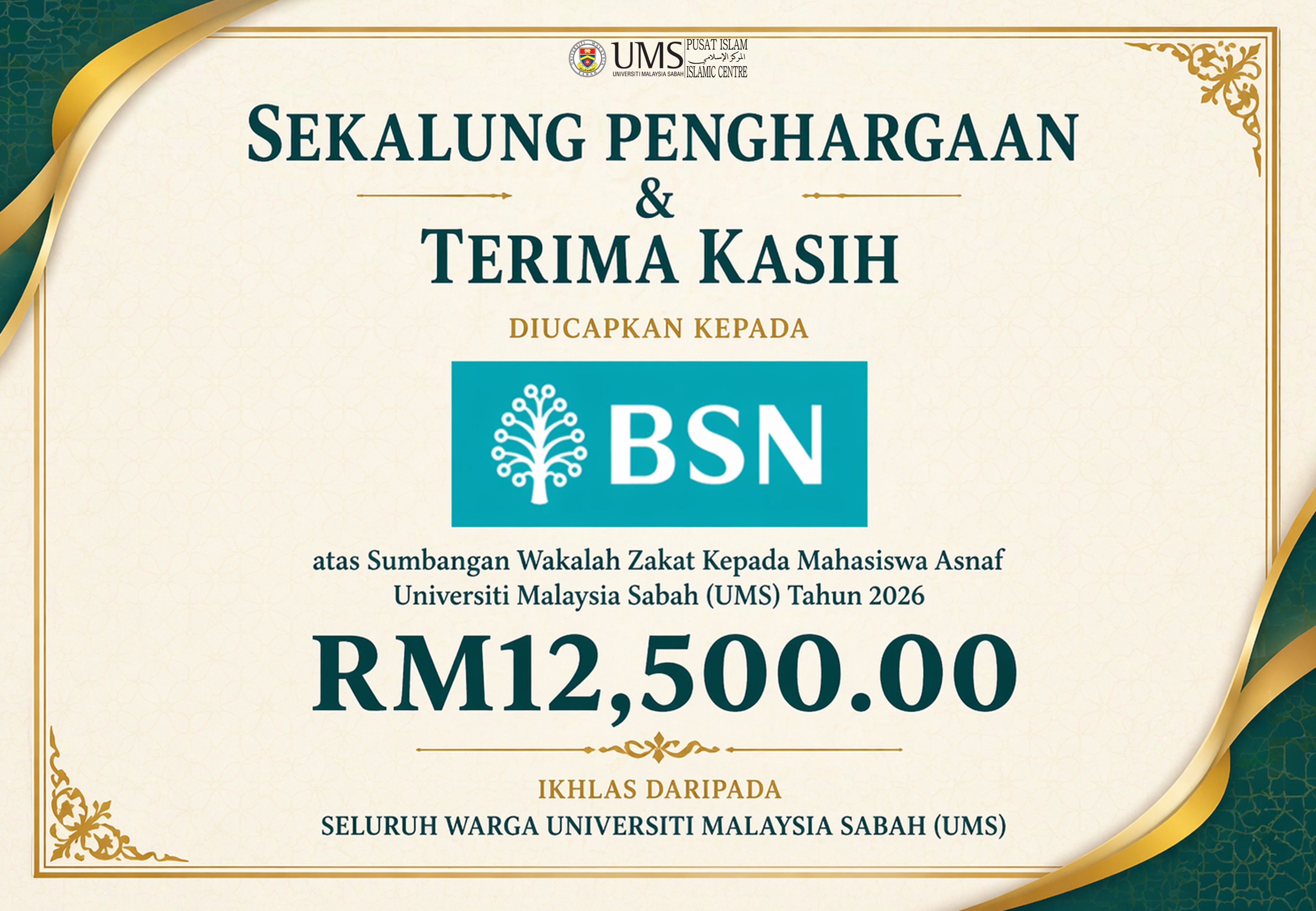 Sekalung penghargaan dan terima kasih diucapkan kepada Bank Simpanan Nasional atas sumbangan Wakalah Zakat kepada Mahasiswa Asnaf Universiti Malaysia Sabah (UMS) Tahun 2026 berjumlah RM12,500.00.