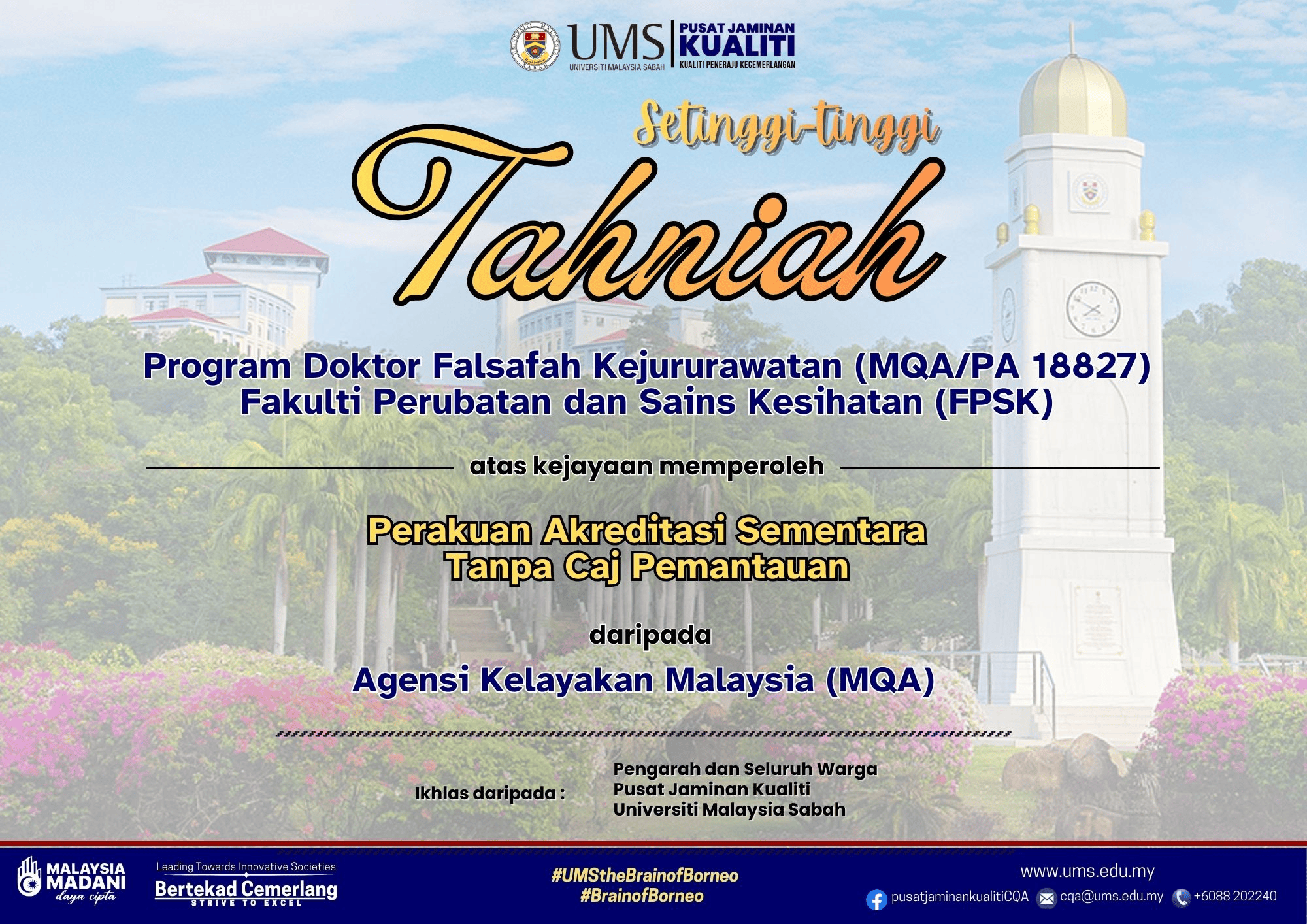 Setinggi-tinggi tahniah kepada Program Doktor Falsafah Kejururawatan (MQA/ PA 18827), Fakulti Perubatan dan Sains Kesihatan UMS atas kejayaan memperoleh Perakuan Akreditasi Sementara Tanpa Caj Pemantauan daripada MQA.