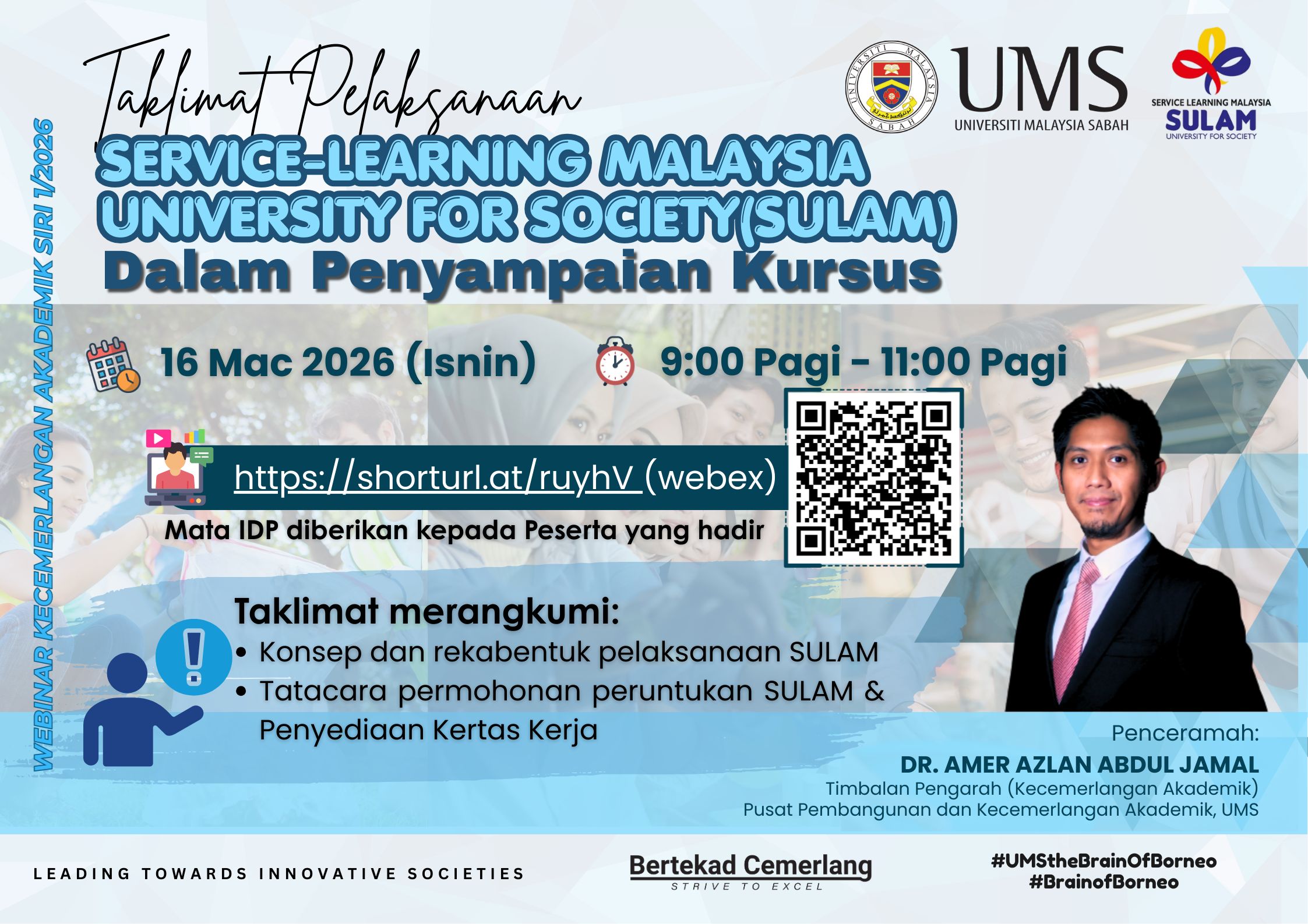 YBrs. Prof./Dr./Tuan/Puan dijemput untuk menyertai Taklimat Pelaksanaan Service-Learning Malaysia University for Society (SULAM) dalam Penyampaian Kursus yang akan diadakan seperti ketetapan berikut:
