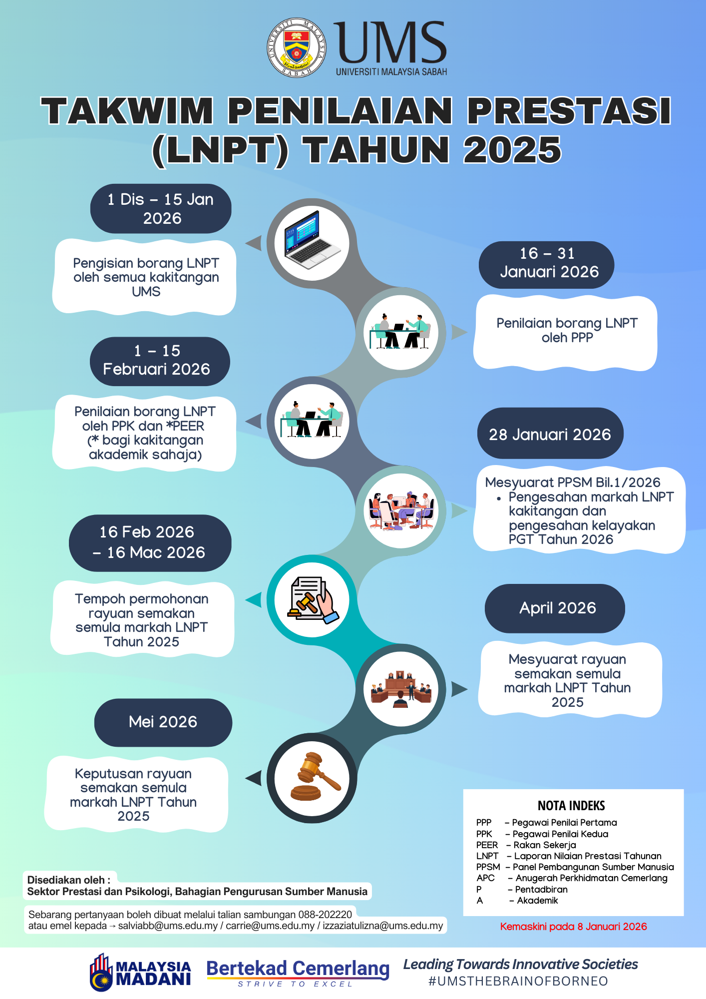 Dimaklumkan bahawa semua kakitangan UMS yang berstatus aktif WAJIB mengisi LNPT bagi tahun 2025.