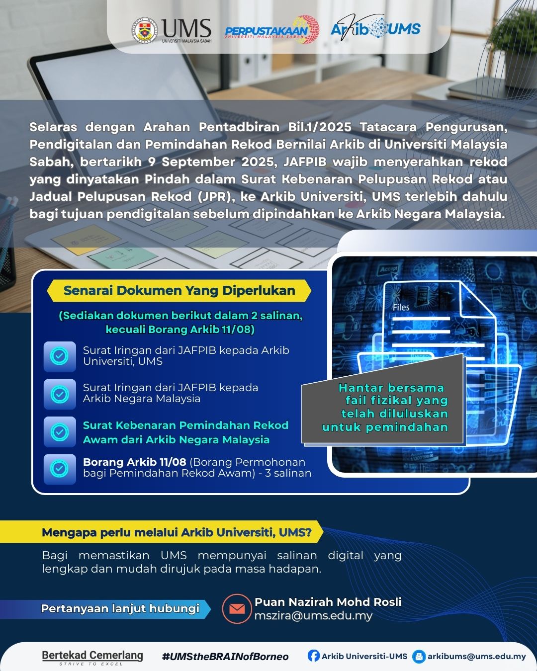 Pihak Arkib Universiti ingin memaklumkan mengenai tatacara pemindahan rekod universiti bagi semua JAFPIB di UMS. Bersama-sama ini dilampirkan poster sebagai panduan.
