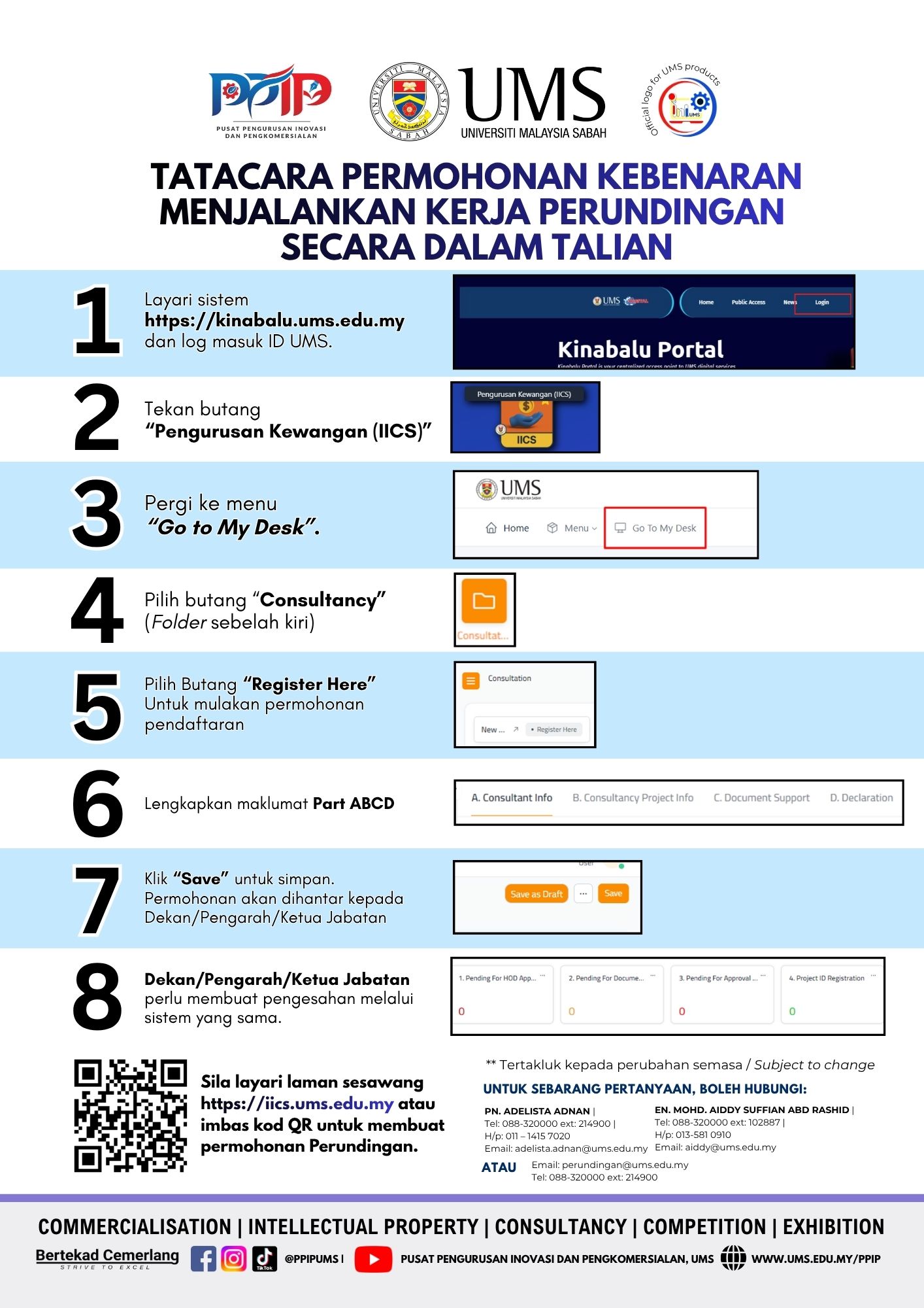 Permohonan kebenaran untuk menjalankan kerja perundingan secara dalam talian hendaklah dibuat melalui sistem yang disediakan dengan mengikuti langkah-langkah berikut: