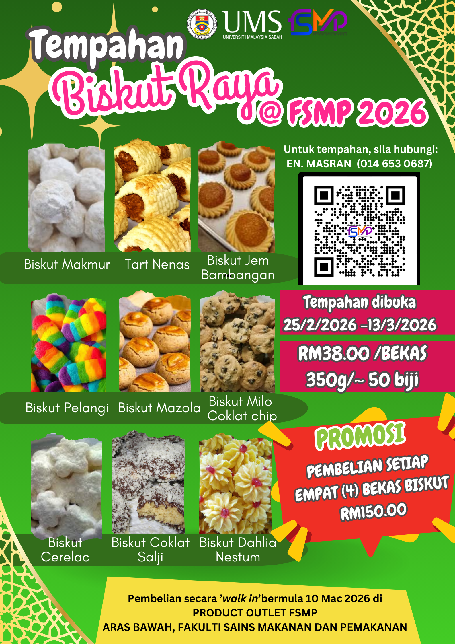 Berita baik 🎉 Tempahan Biskut Raya @ FSMP 2026 kini dibuka kepada semua kakitangan UMS.