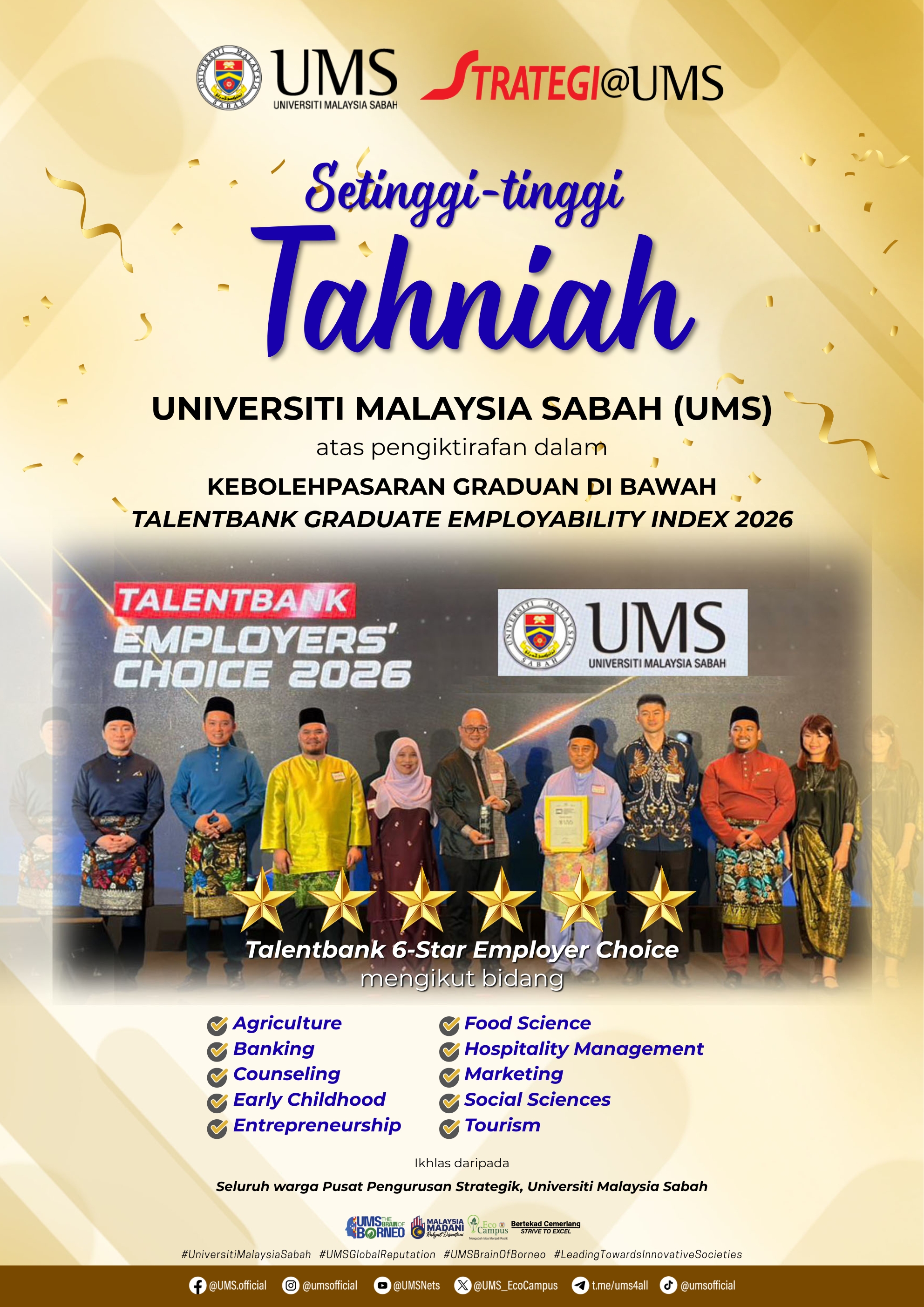 Universiti Malaysia Sabah (UMS) merakamkan ucapan setinggi-tinggi tahniah atas pengiktirafan yang diterima dalam Kebolehpasaran Graduan di bawah Talentbank Graduate Employability Index 2026. UMS telah dinobatkan sebagai Talentbank 6-Star Employer Choice, merangkumi bidang: