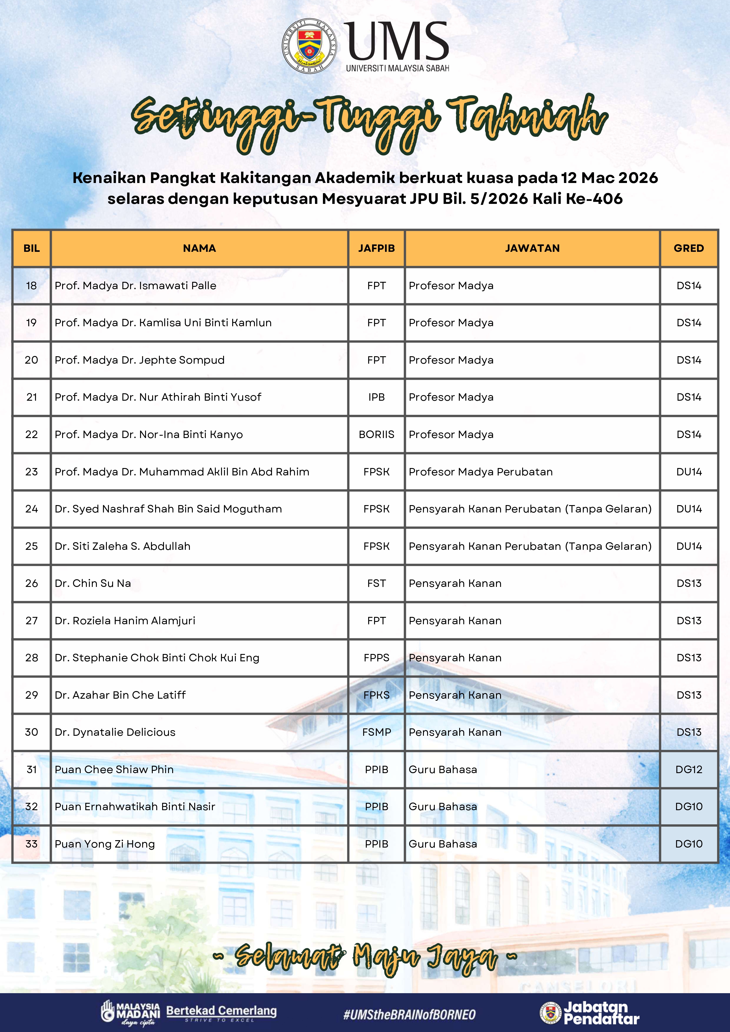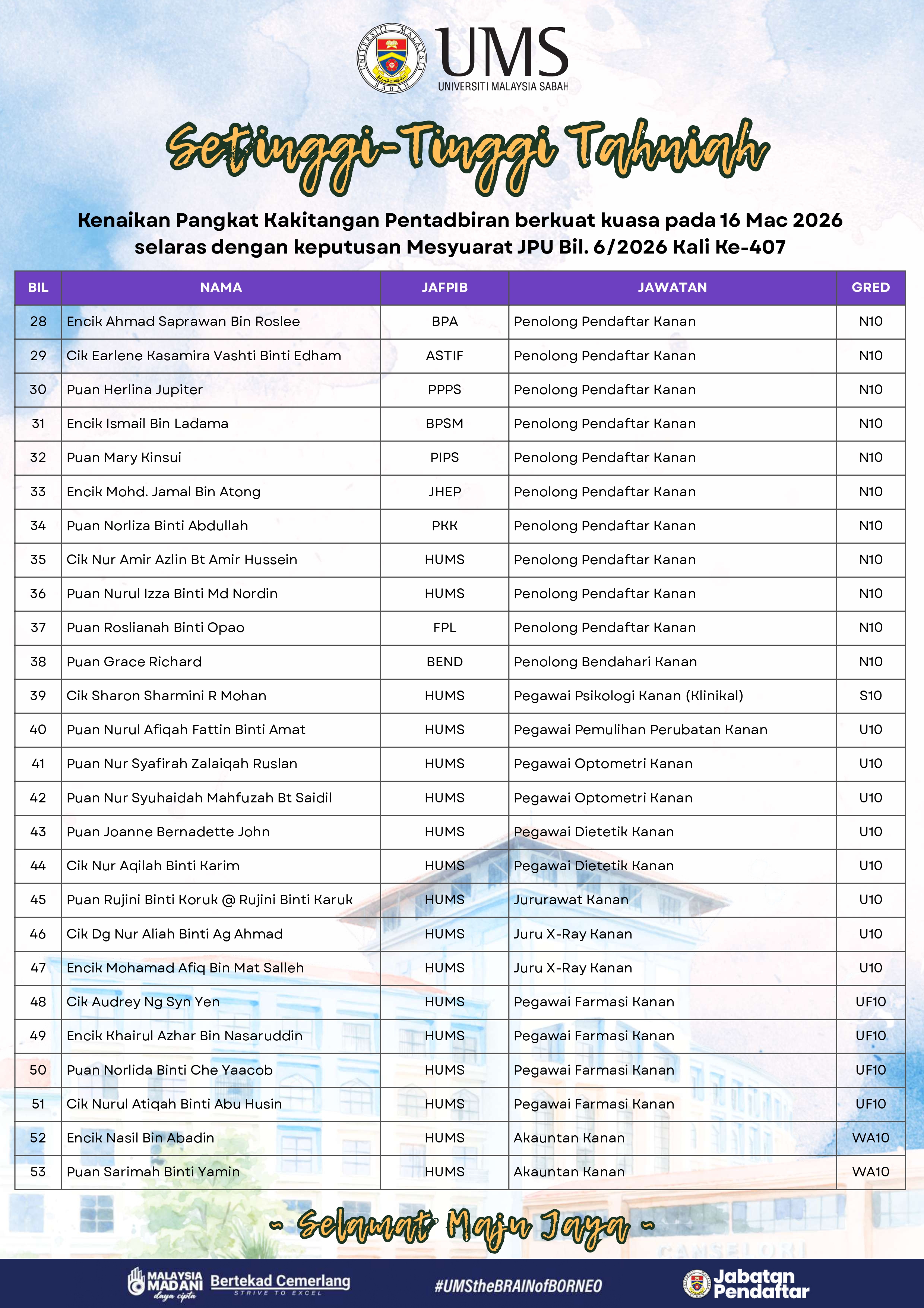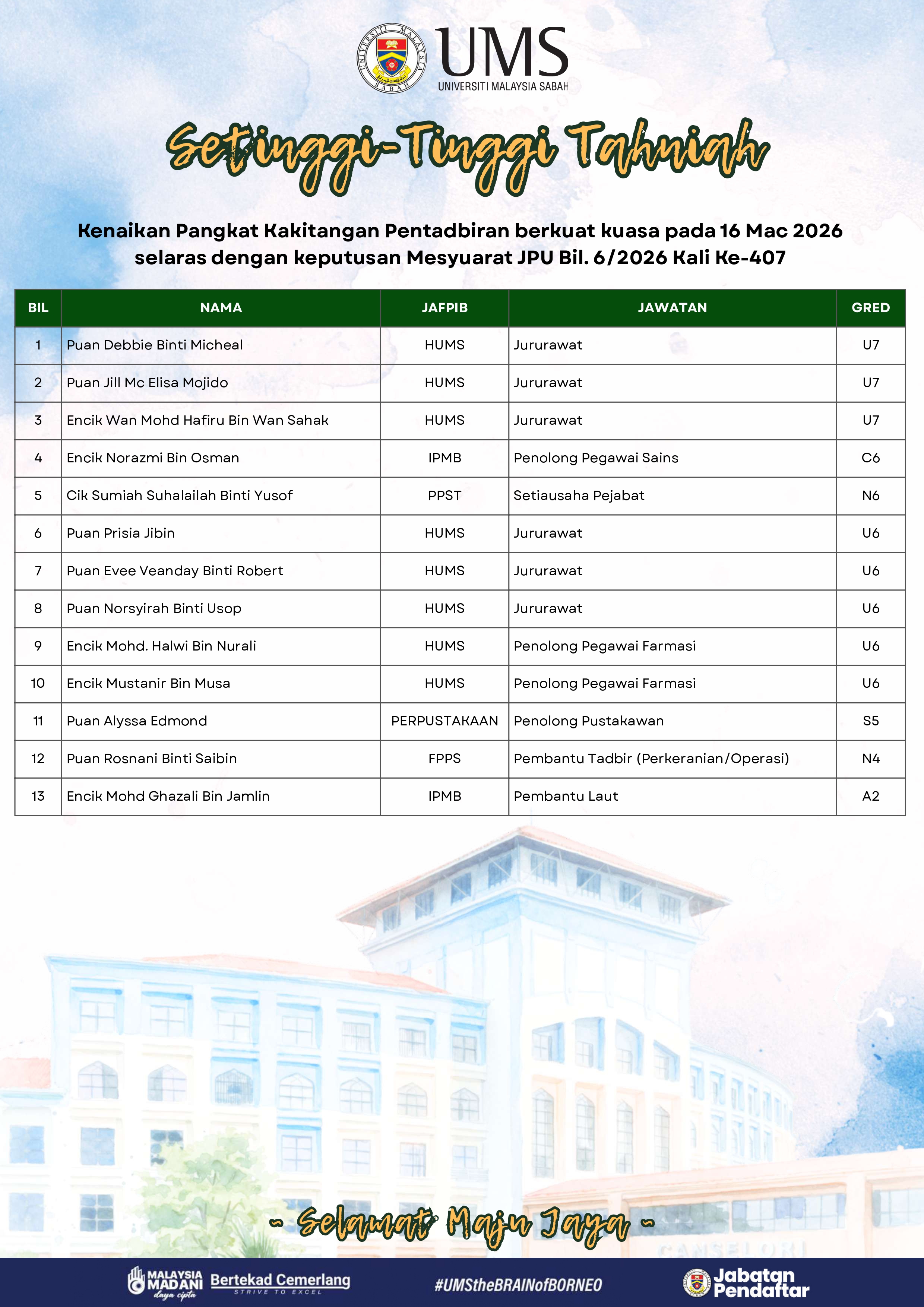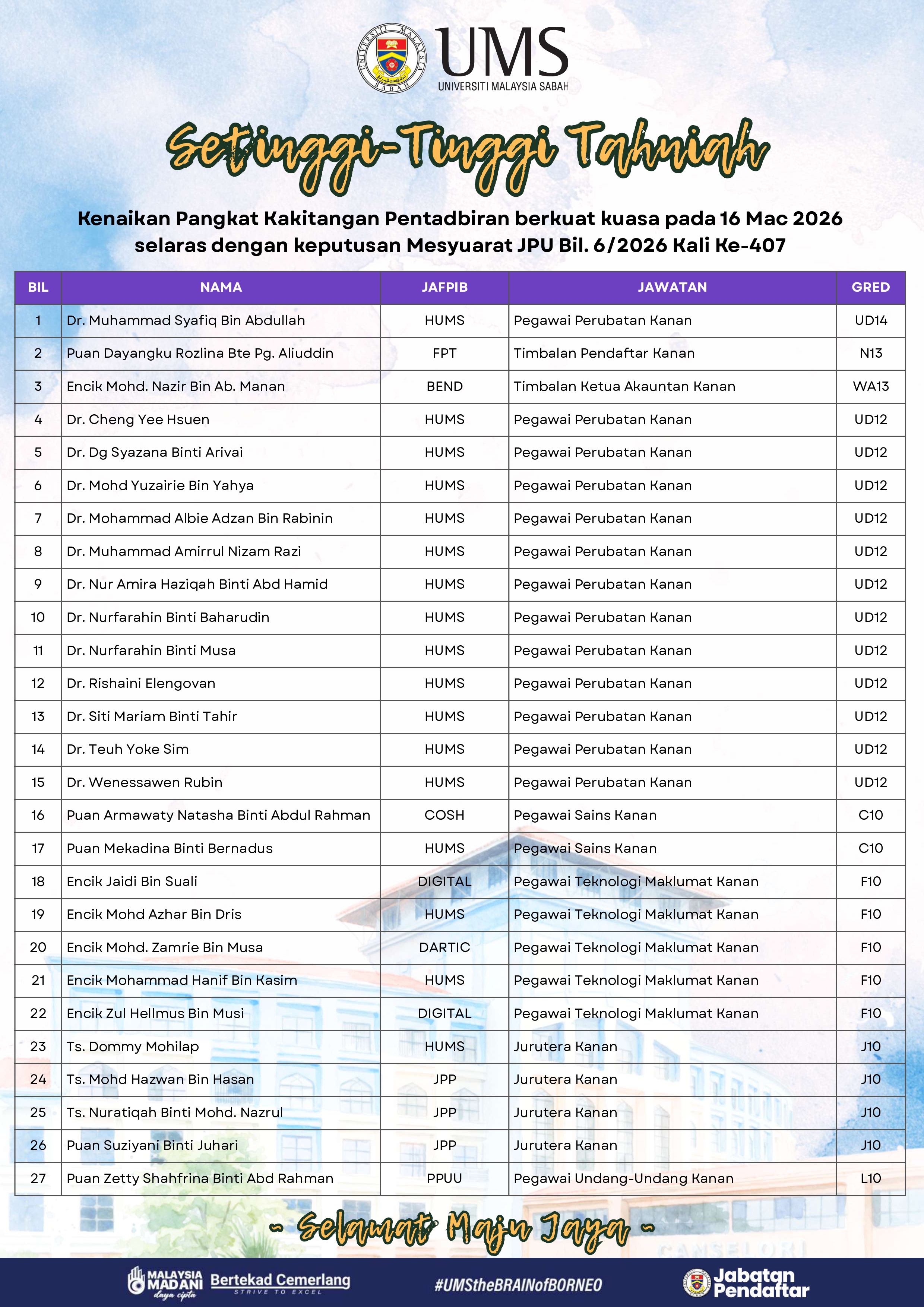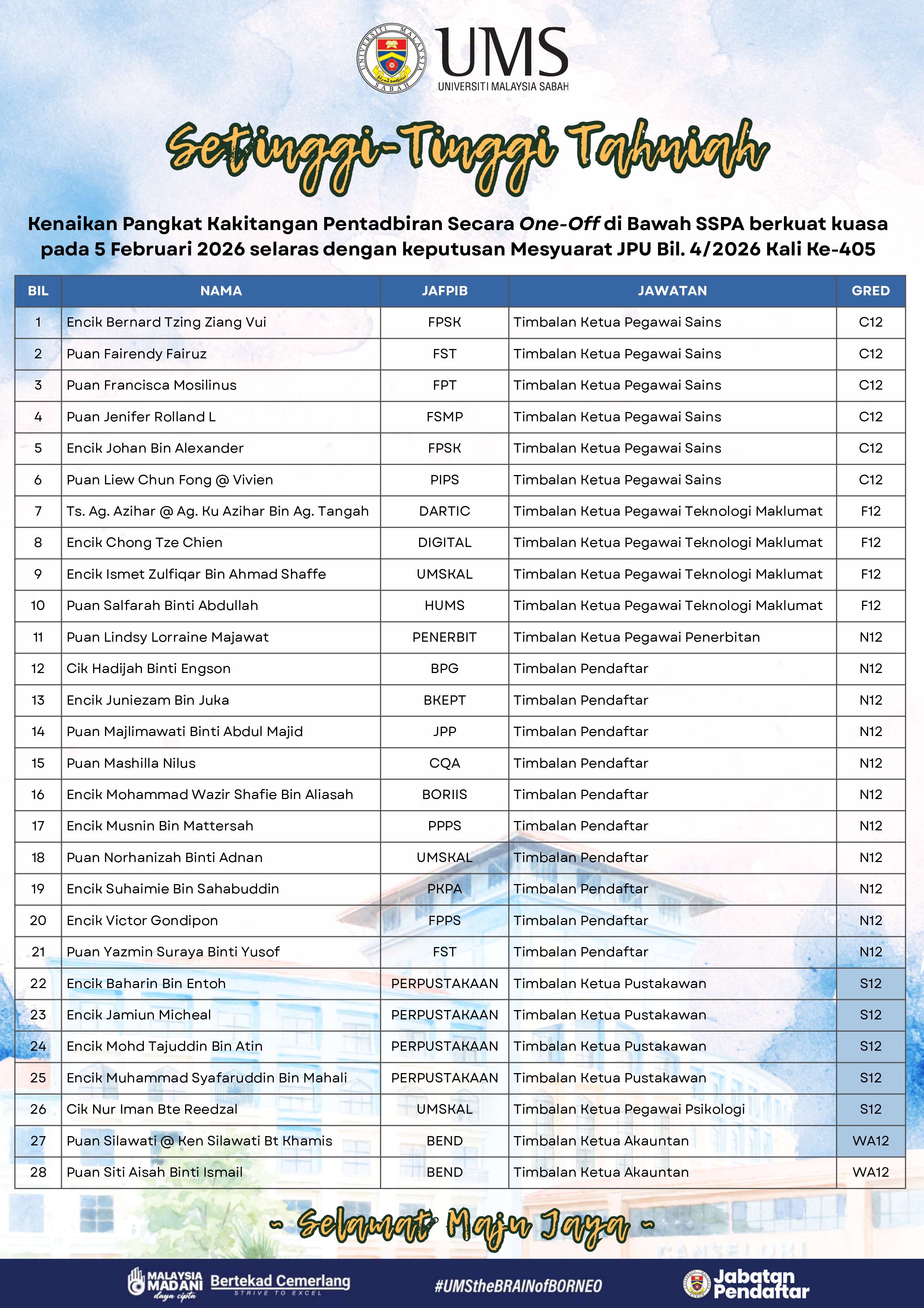 Pihak Pengurusan Universiti merakamkan setinggi-tinggi tahniah kepada semua kakitangan yang terlibat atas kejayaan ini. Kenaikan pangkat tersebut merupakan satu pengiktirafan terhadap komitmen, kecekapan, integriti serta sumbangan berterusan dalam memperkukuh kecemerlangan Universiti.