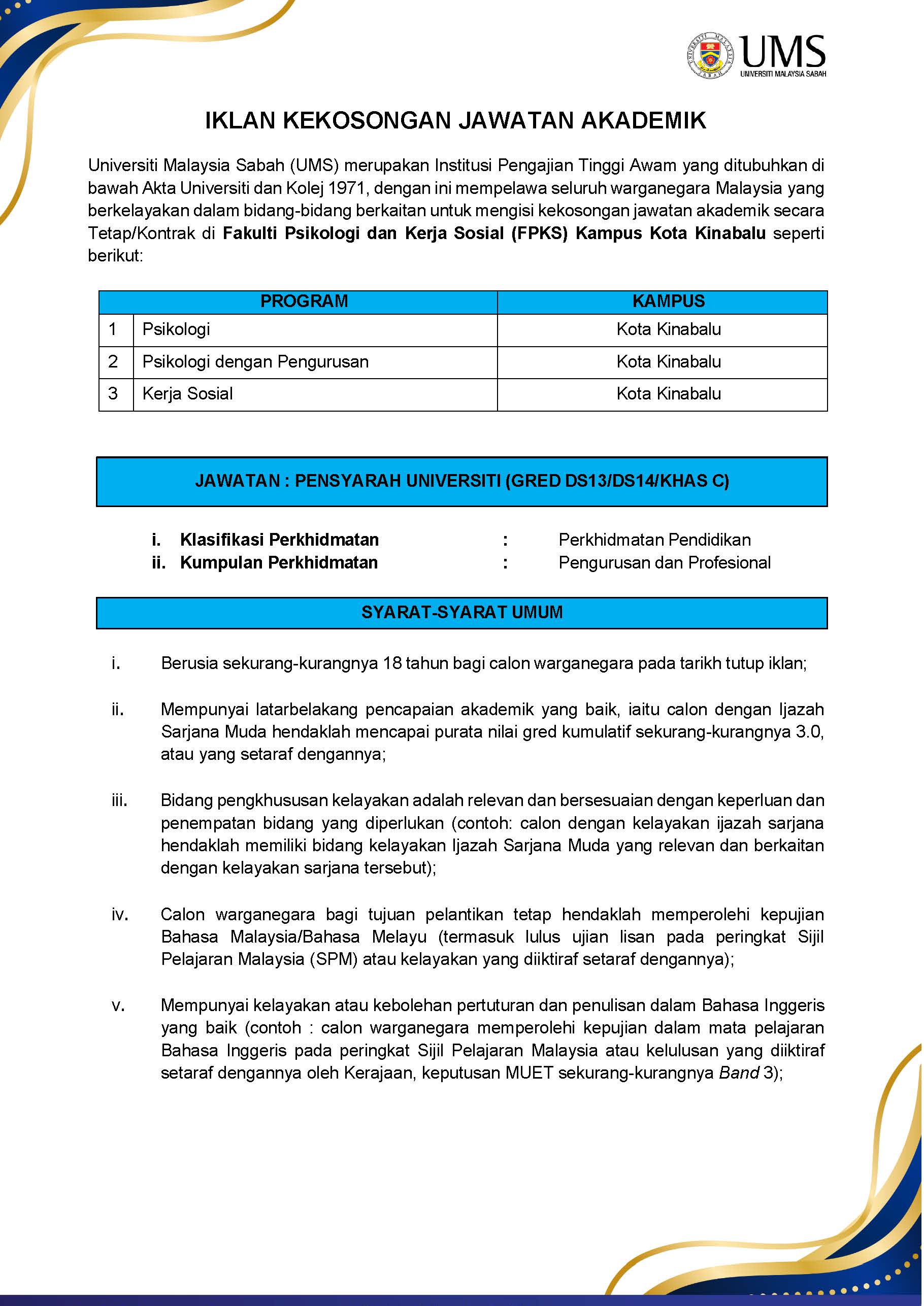 Jawatan Kosong Akademik Fakulti Psikologi dan Kerja Sosial Universiti Malaysia Sabah